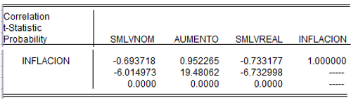 En general, cuando se relacionan pares de datos, la relación tiende a ser significativa cuando los resultados se acercan a uno. Dentro de la tabla, en el primer renglón se observa que, en todos los casos, la inflación si tiene una relación con las variables tomadas sobre el salario mínimo (todos los valores de 0,69, 0,95 y 0,73 son más cercanos a uno que a cero (sin considerar todavía el signo)).