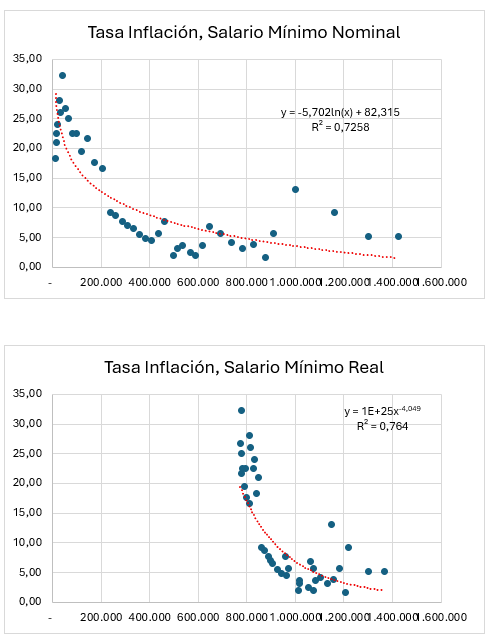 Como se observa en las dos siguientes gráficas, se invierte la relación, pues ya no se parte de puntos cercanos a cero, sino de puntos altos, y se decrece hacia la parte inferior derecha. Esto quiere decir que un mayor nivel de salario mínimo (ya sea nominal, o real) está relacionado con un menor nivel de inflación.