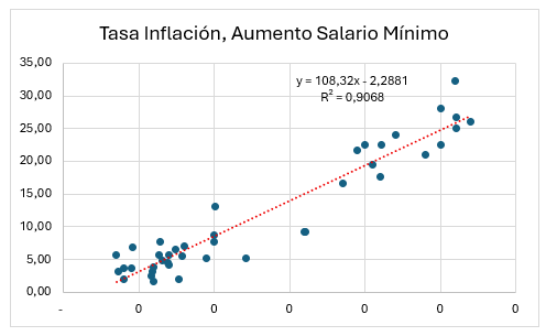Esto, porque la relación entre las tasas porcentuales describe la forma básica en que tradicionalmente se asocian estas variables, pero el valor del salario puede representar un impacto sobre el cual la inflación se va ajustando por cambios generados en el mercado, luego de que se da a conocer el aumento.