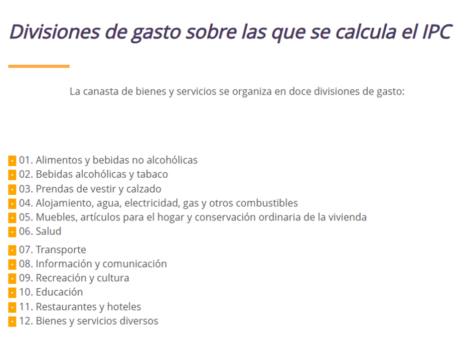 Al respecto, el Departamento Administrativo Nacional de Estadística (DANE) muestra los tipos de productos (artículos que se consumen en los hogares) agrupados por conjuntos que llama “divisiones de gasto”, como se muestra en la siguiente imagen: