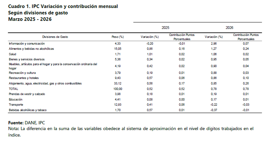 En el documento anexo al final de la presente nota, se encuentran los boletines completos desde octubre de 2025, hasta marzo de 2026, organizados del último al primero y a continuación, para evitar mostrar demasiadas tablas, se dispone solo la tabla de cambios de precios por tipos de gasto, del último mes: