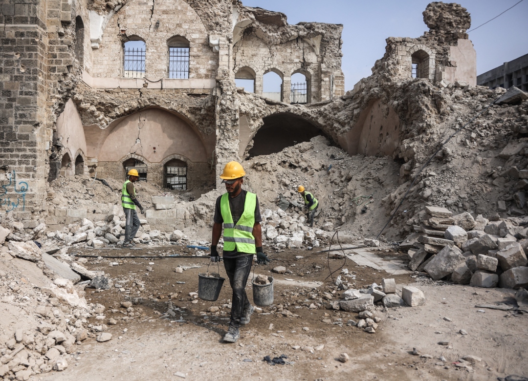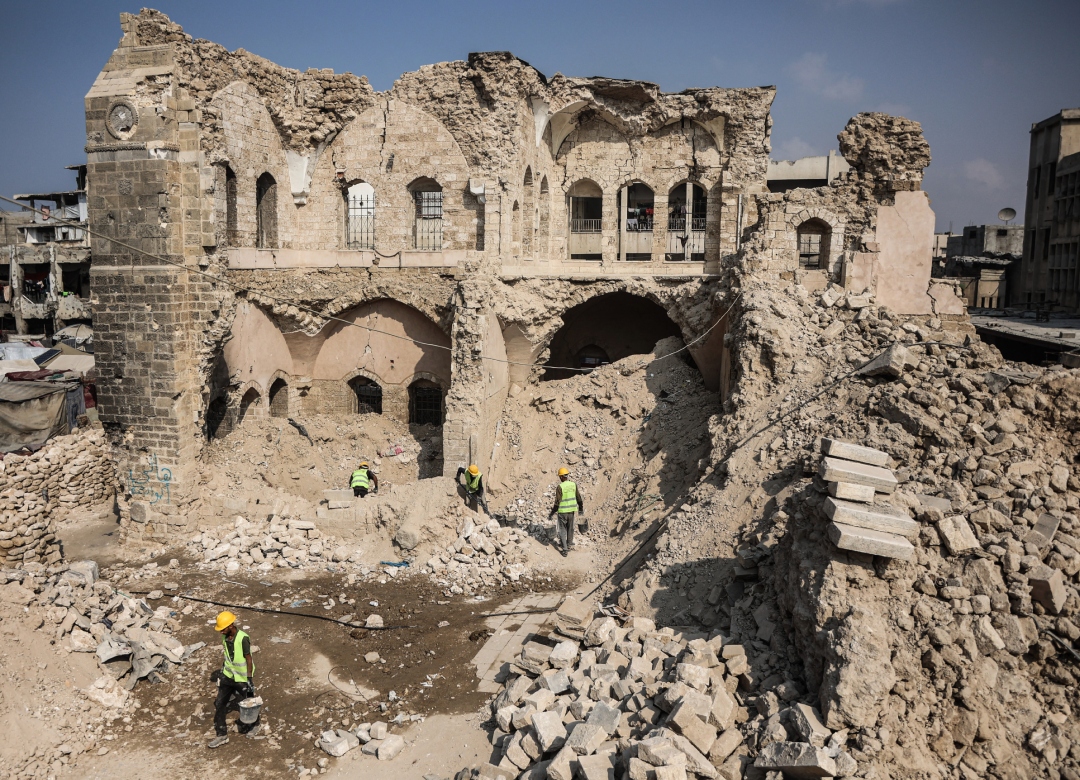 Cerca de una montaña de escombros de varios metros, un artesano restaura cuidadosamente una piedra decorada con una cruz coronada por un creciente islámico, mientras otro limpia una escultura grabada con caligrafía árabe.