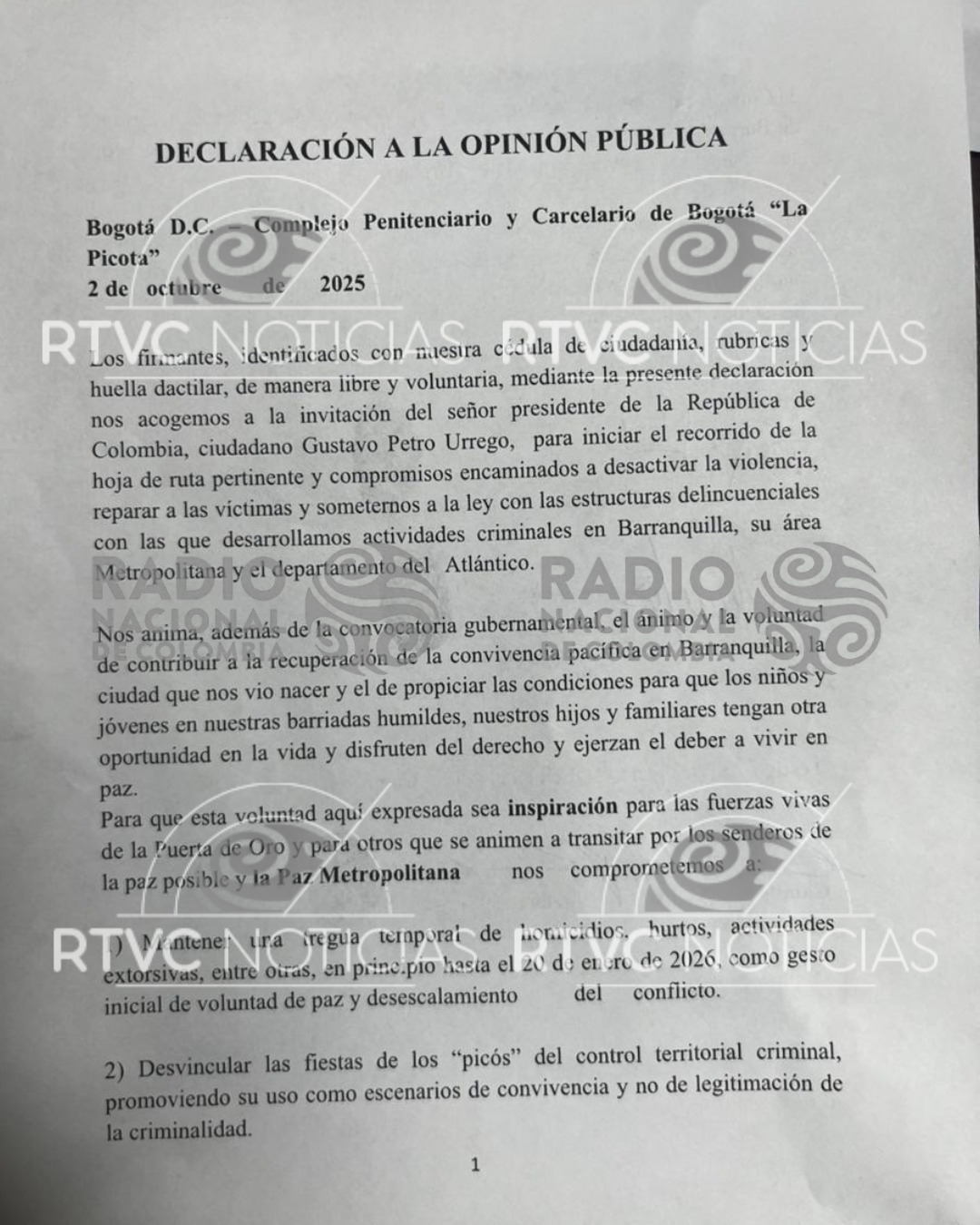1. “Nos comprometemos a mantener una tregua temporal de homicidios y hurtos en principio hasta el 20 de enero de 2026, como gesto inicial de voluntad de paz”.
