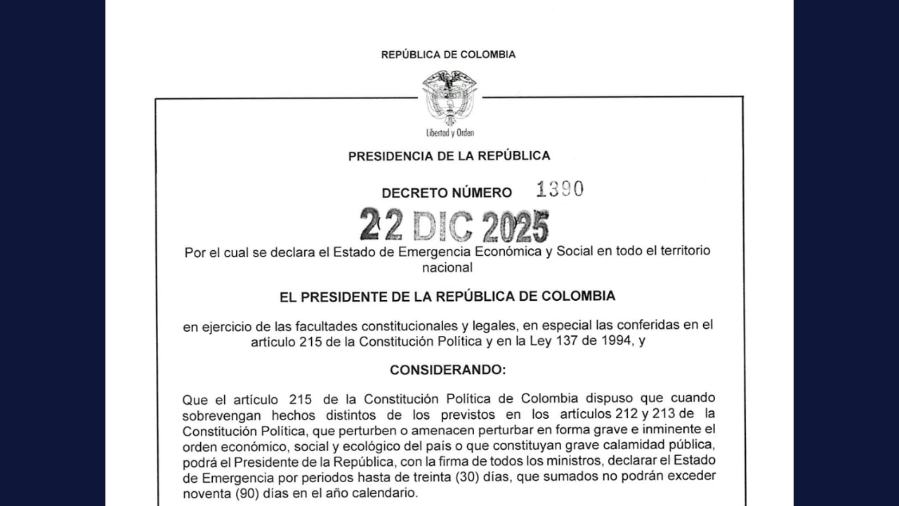 El Gobierno nacional expidió el Decreto 1390 del 22 de diciembre de 2025, mediante el cual declaró el Estado de Emergencia Económica y Social en todo el territorio nacional por treinta (30) días calendario, contados desde la vigencia del decreto. La decisión habilita al Ejecutivo para expedir decretos legislativos y realizar operaciones presupuestales dirigidas, según el propio texto, a conjurar la crisis y evitar que sus efectos se profundicen.