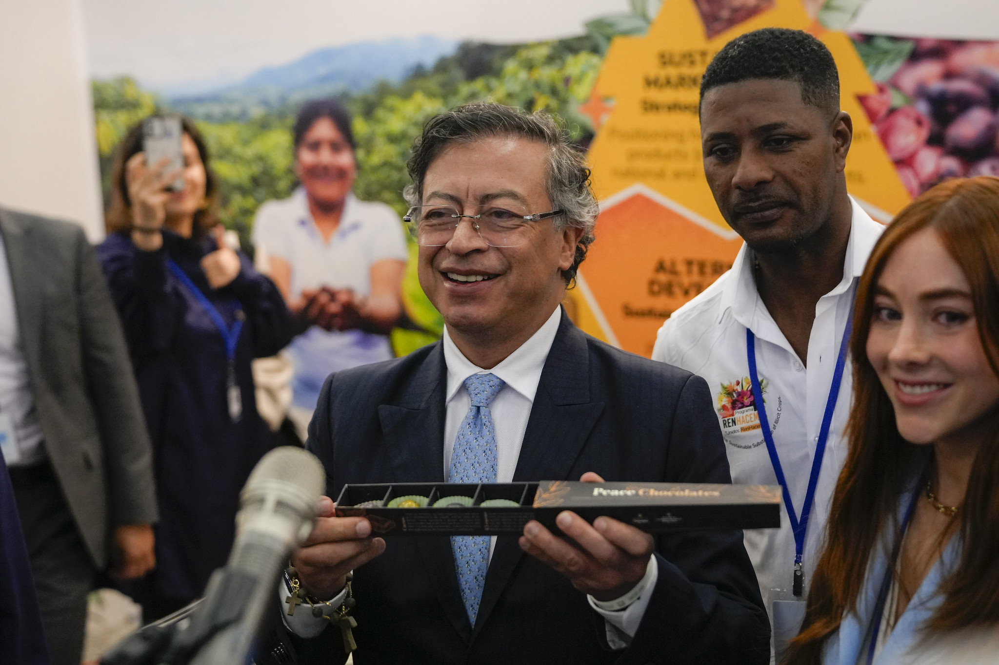 En materia de cultivos, el mandatario informó que 30.000 familias campesinas han comenzado a erradicar voluntariamente sus matas de coca y a sembrar productos lícitos, con una meta de 42.000 hectáreas erradicadas para mayo —van 21.000— bajo verificación de la ONU. El mandatario atribuyó el punto de partida al gobierno de Iván Duque, señalando que las hectáreas de coca "se duplicaron" en esa administración, y que el suyo logró detener esa tendencia y comenzar a revertirla.