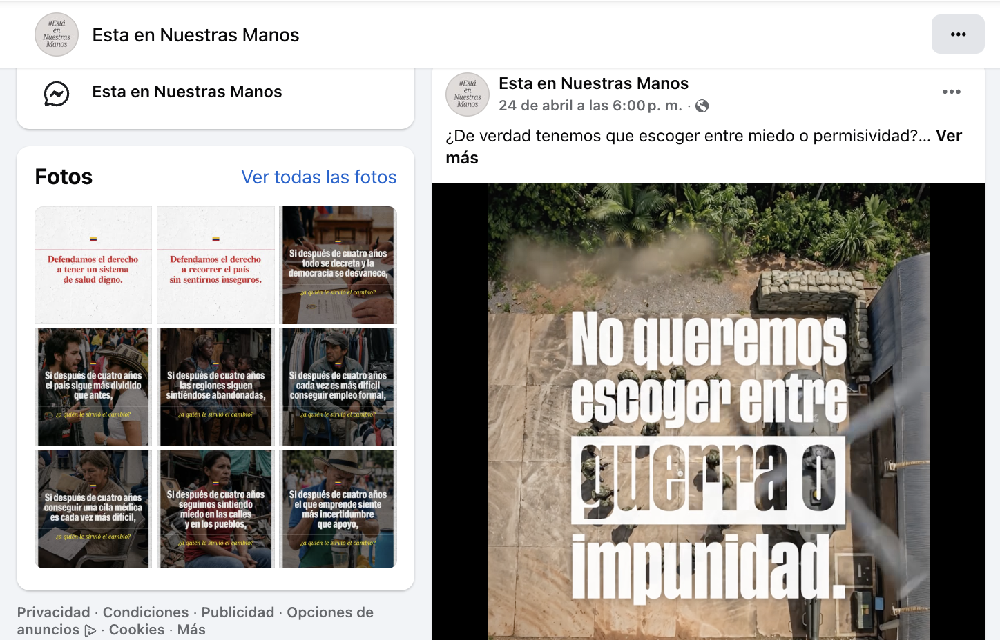 Una investigación publicada por la plataforma Hyperconectado.co documentó que la página de Facebook "Esta en Nuestras Manos", que se describe como "pensamientos de un colombiano para otro colombiano, más allá de partidos políticos y odios sembrados", operó el 27 de abril con aproximadamente 260 anuncios políticos activos en circulación simultánea, sin que nadie haya declarado quién los financia ni cuánto cuestan, en violación directa de las normas de Meta para publicidad política. La página fue mencionada previamente en la investigación de Señal Investigativa sobre el Proyecto Júpiter.
